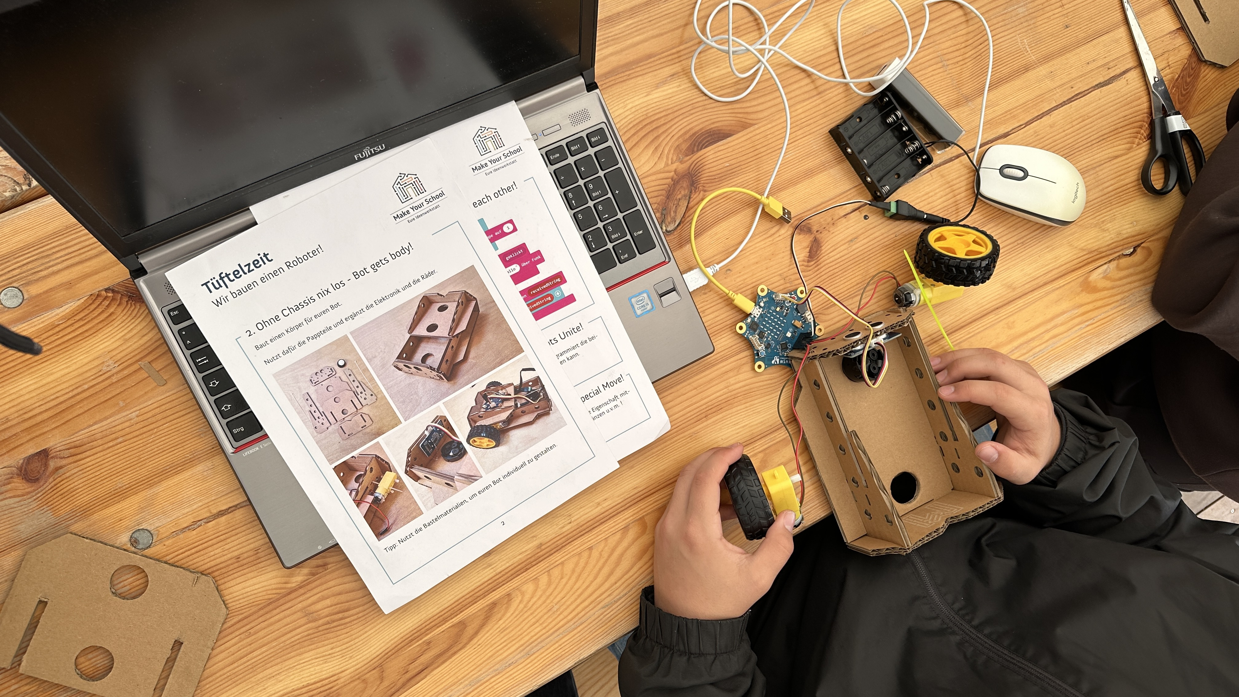 Werdet selbst aktiv, baut und programmiert gemeinsam euren eigenen Roboter. Es stehen euch verschiedene elektronische und analoge Hilfsmittel wie LEDs, Sensoren und Mikrocontroller, aber auch Bastelmaterialien zur Verfügung. Unterstützt werdet ihr dabei von Mentor:innen aus Bereichen wie Informatik, Elektrotechnik, Maschinenbau und Design.